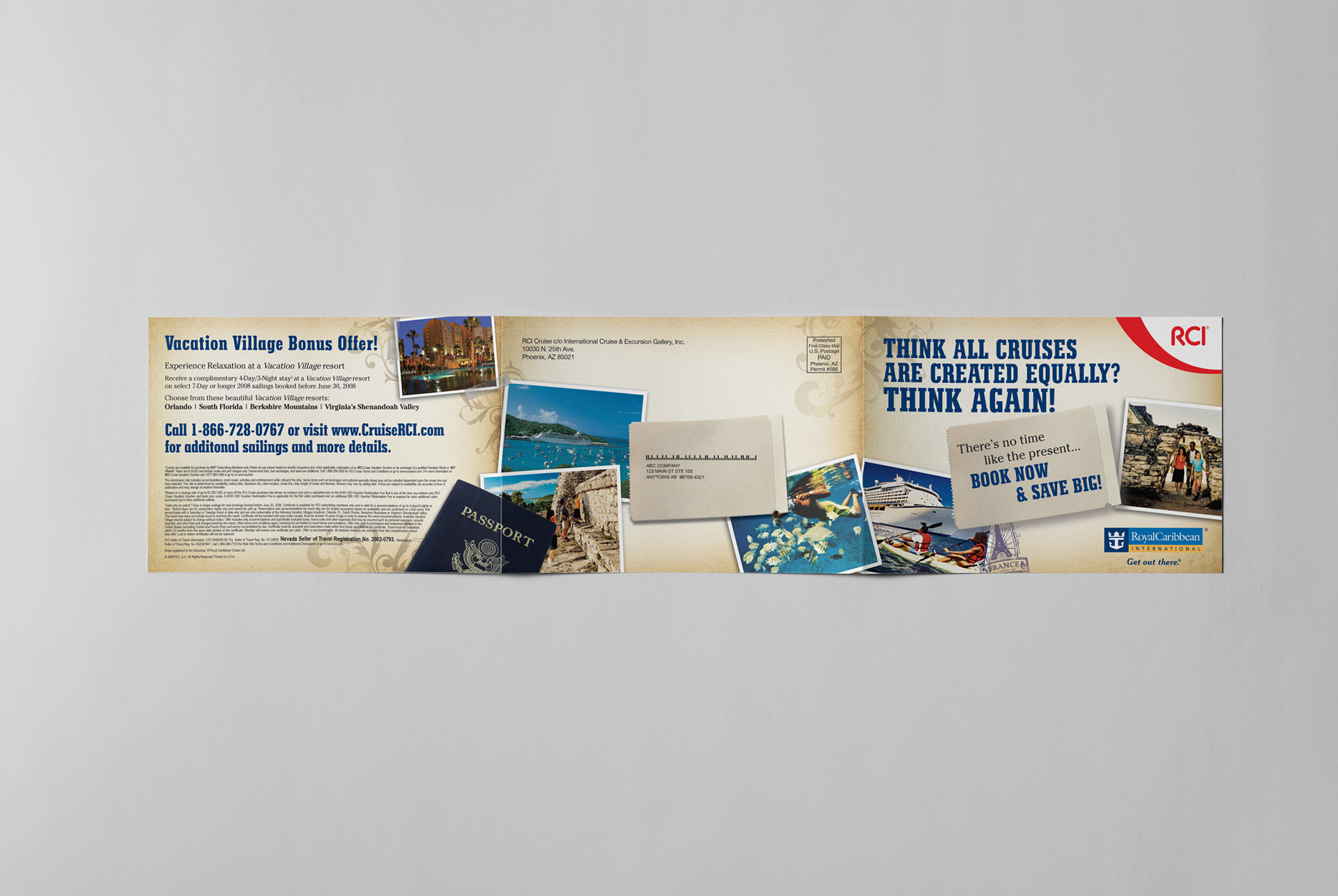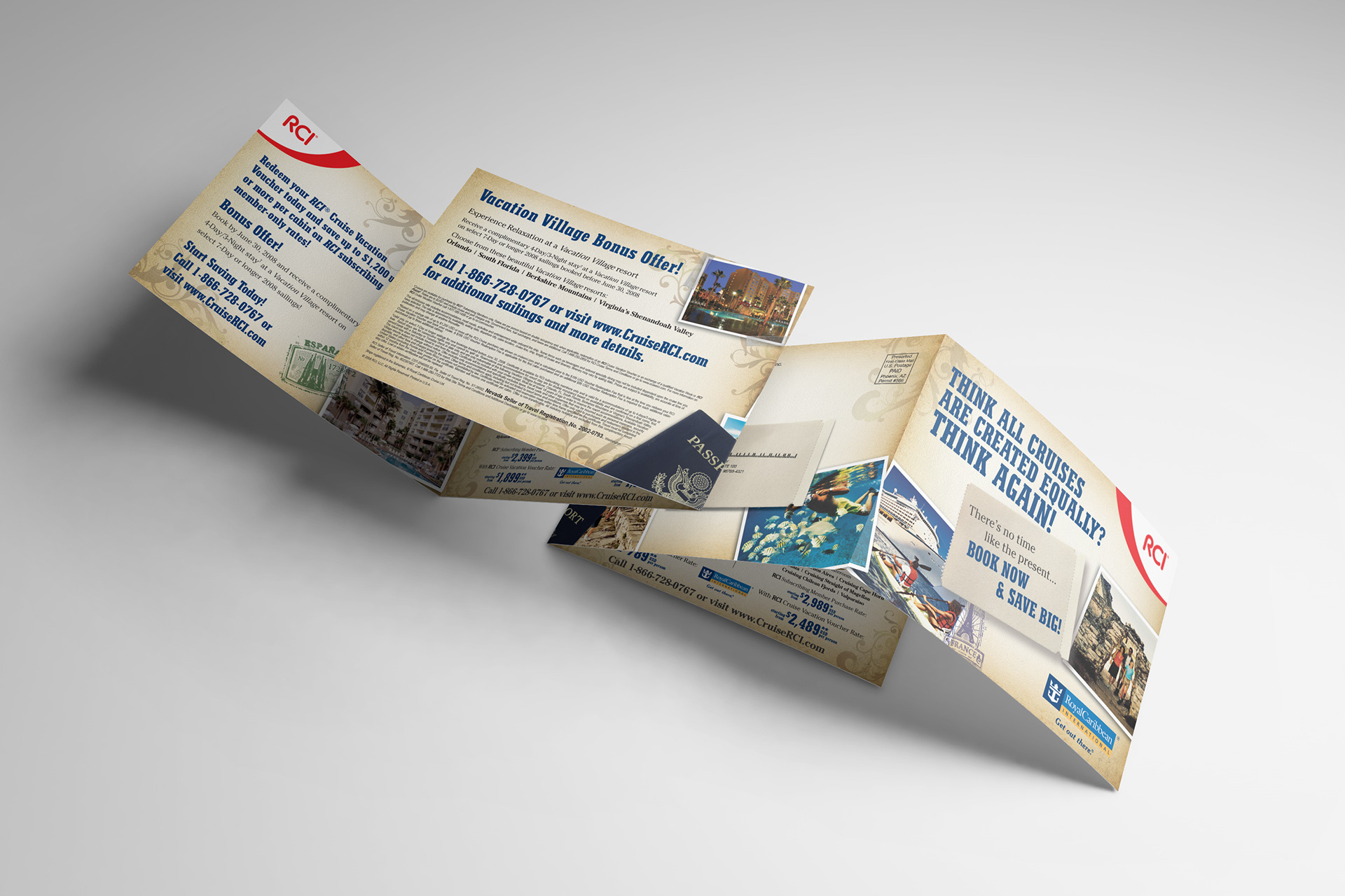 Brochure was created as direct mail piece to promote a bonus offer by co-brands RCI (Resort Condominiums International) and Royal Caribbean International.